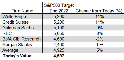 Reuters has compiled 6 of the major Wall Street firm’s predictions for the end of 2022 S&P500 target and they are as follows (from highest to lowest).